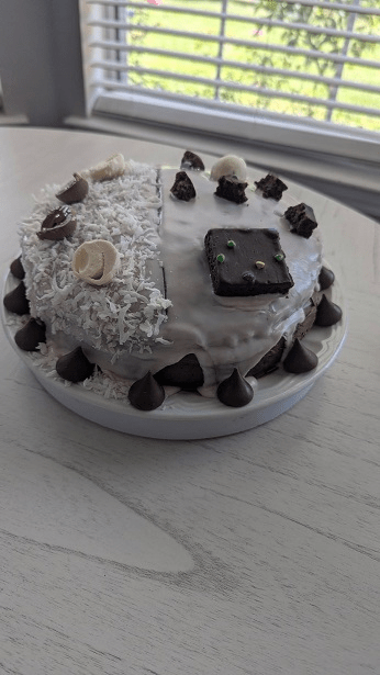 Ma wanted coconut on half so my made a line down the frosting and she added coconut to her side. Next I cut some Lindt chocolate candy balls, some were raspberry, some blueberry and the others were almond and put them around the top of the cake with some Cosmic brownies. To finish it over, I added Hershey kisses around the bottom of the cake. As I was twirling the cake around in the video, mommy was across the table maybe funny faces and I was trying not to laugh.