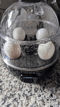 When I got home I was excited to make hard boiled eggs in my new cooker and it is so easy! You fill the bottom of the maker with water, put the egg holder on it (you can double stack them if you want to boil a dozen) and after you poke a hole in the large end of the eggs, put them in the tray and push a bottom. It shuts off automatically when they are done. I don’t know how the machine knows when they are done but after I set them in ice water for a bit I gave them a try. They pealed very easy and the eggs were cooked to perfection!