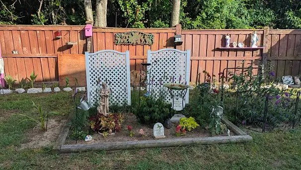 I turned our vegetable garden into Rich’s Memory Garden and I had it done in time for Easter but have been working on it since then adding even more plants and plaques. The first picture was taken in April after the plants started to grow. It didn’t take long for the garden to become so beautiful. Even the birds have been visiting the bird baths and I was lucky to snap a picture of this female cardinal getting a drink.