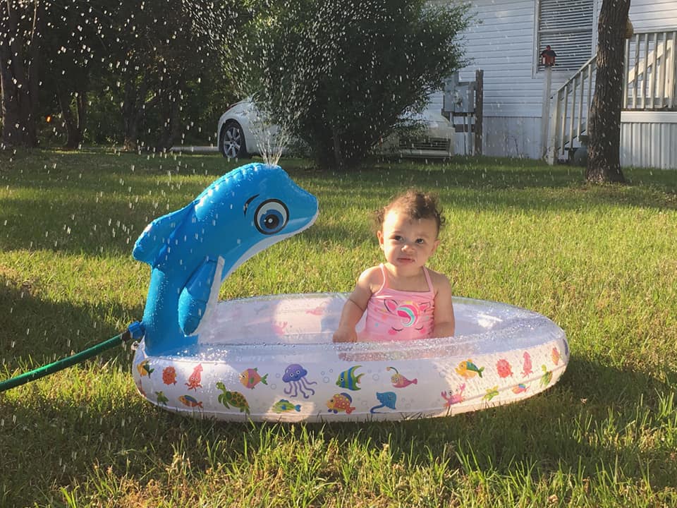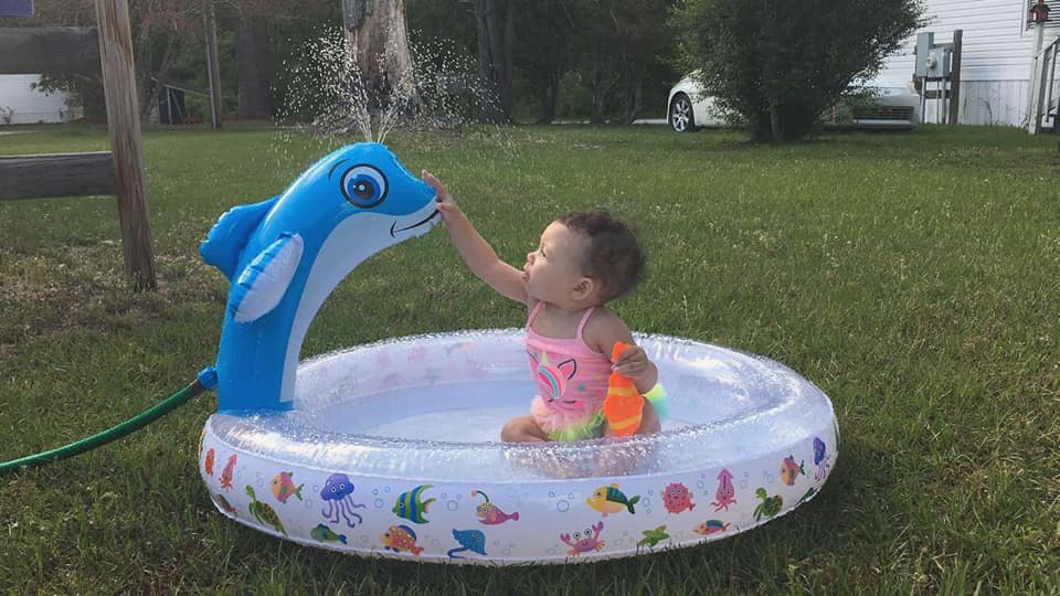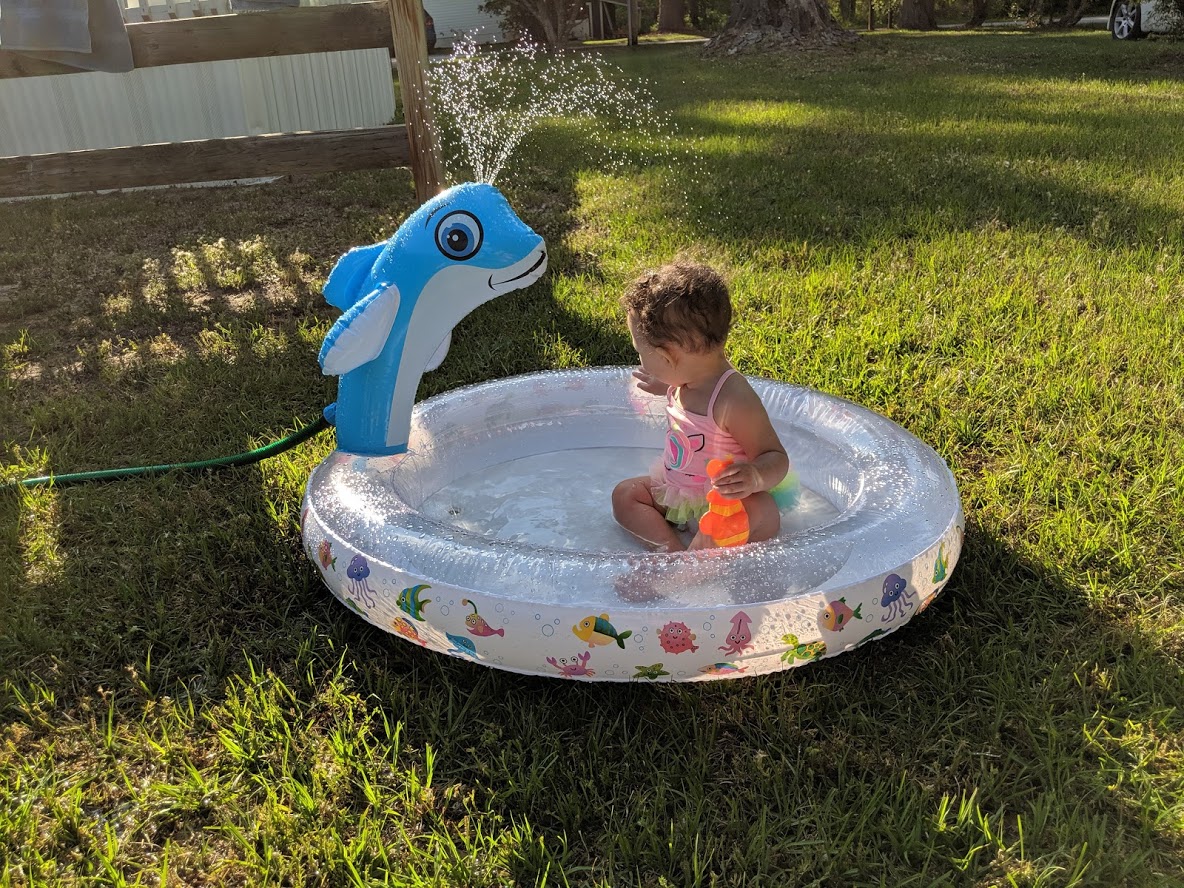This is such a fun inflatable kiddie pool with Dolphin sprinkler and the first time my 9 month old great granddaughter went in it, she loved it. She enjoys watching sea life movies and the Dolphin was a big hit for her! We weren’t sure what Lia would think about the water squirting out of the dolphin but she laughed when the water sprinkled on her head.