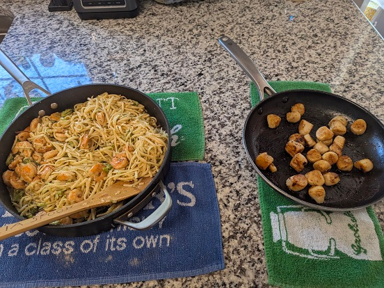 My shrimp scampi dinner is served with a side of scallops and garlic knots. I made this when my “church angels” came over for dinner and what a enjoyable meal and company.