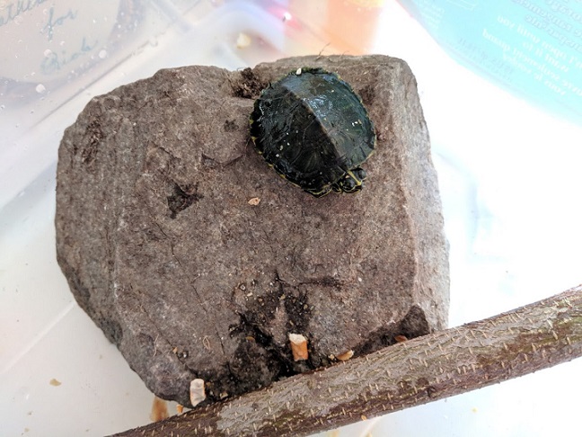 She carefully set him on a rock and there he sat, still not moving. Lucy decided to crumbled up some crackers and sprinkled them in the water and all of a sudden Tiny slide of the rock and started moving around in the water! He ate some crackers then hid under the branches. Lucy decided to name the turtle Tiny because of his size.
